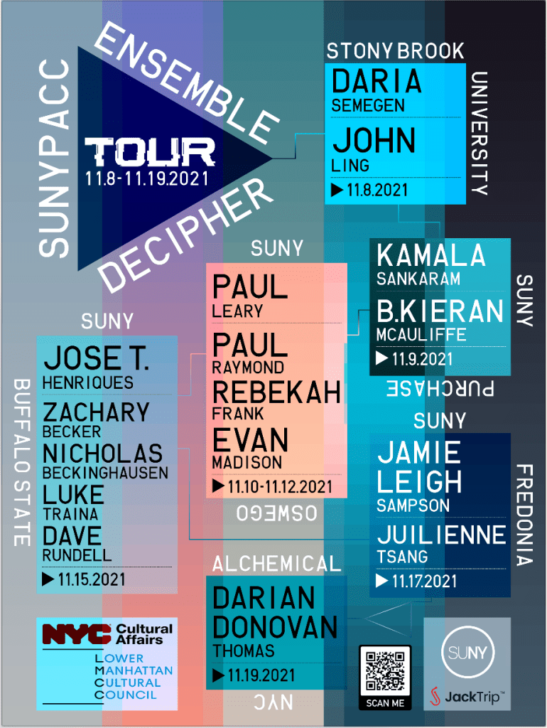 Ensemble Decipher has toured SUNY schools across the NY state with new commissions from SUNY faculty and students. More information and media can be found HERE