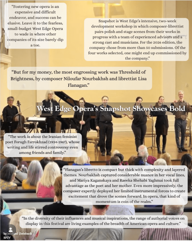 The San Francisco Classical Voice review of West Edge Opera’s Snapshot program highlights Niloufar Nourbakhsh’s Threshold of Brightness as one of the most compelling works in an evening devoted to bold new operatic voices. Created with librettist Lisa Flanagan and inspired by the life of Iranian poet Forugh Farrokhzad, the opera is praised for its nuanced vocal writing and layered emotional complexity, demonstrating a strong command of musical storytelling within a compact form. Presented as part of a workshop setting designed to develop new operas, the piece stands out for its depth, theatrical sensitivity, and ability to translate personal and historical themes into a vivid operatic language.